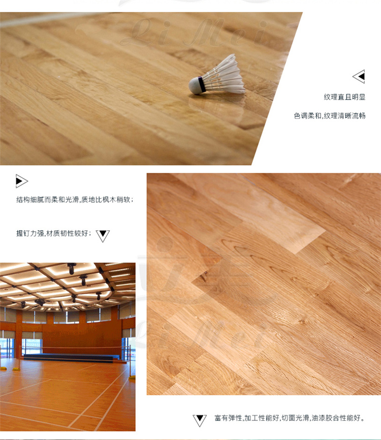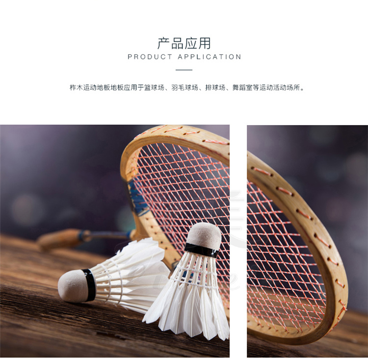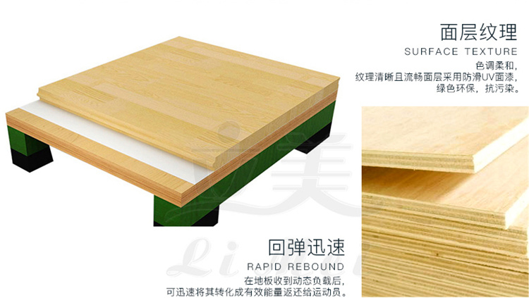 运动木地板具备以下优点:1.环保无污染,纯实木制作,面漆采用达到E1环保标准的;2.可以吸收冲击,减少地面对人体的反作用力;3.防滑有弹性,减少运动人出现失误的可能性,增加运动体验;4.耐用节省成本,20几道工艺的处理,使得面板的硬度非常好,耐磨也耐用。